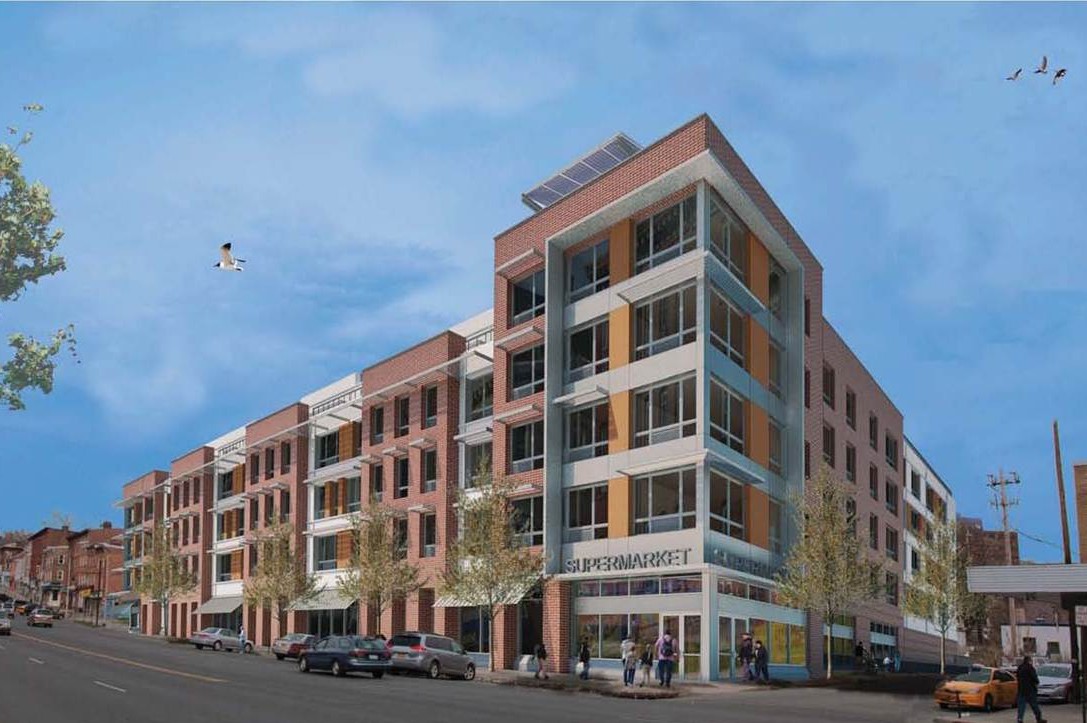 The Newburgh Mid-Broadway Mixed Use project involved the redevelopment of an affordable residential 91-unit housing development on a 1.96-acre portion of a city block in Newburgh, NY. This housing unit is a mix of 1-, 2-, and 3-bedroom configurations with on-site amenities that includes a playground, 155 parking spaces, and a supermarket to serve the complex.